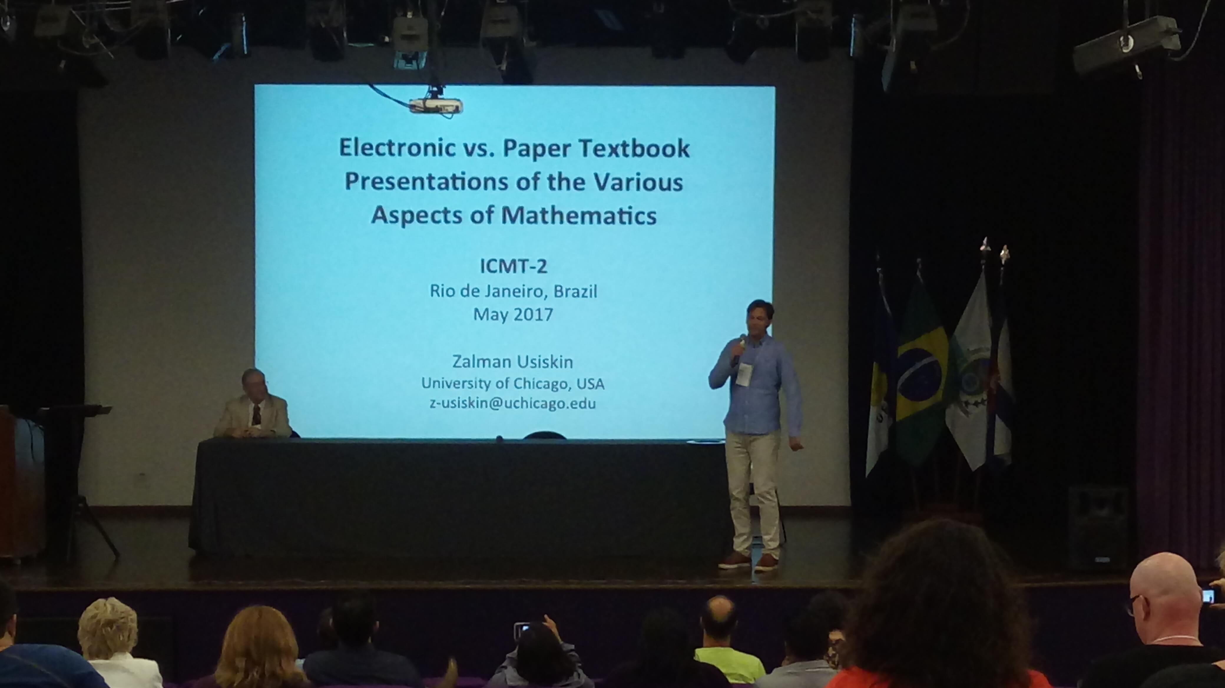 Zalman Usiskin, professor emérito da University of Chicago e diretor geral do School Mathematics Project, abordou os diferentes formatos de livro didático: em papel; eletrônico (tablets, telefones celulares) e híbrido (movendo-se entre as plataformas). O professor ressaltou que alguns aspectos da matemática parecem mais adequados para livros de papel e outros parecem para certos formatos eletrônicos e, com base no trabalho atual de adaptação dos livros didáticos de papel para os formatos digitais, discutiu vários aspectos da matemática, entre eles: vocabulário e notação, dedução, modelagem, algoritmos e representações.